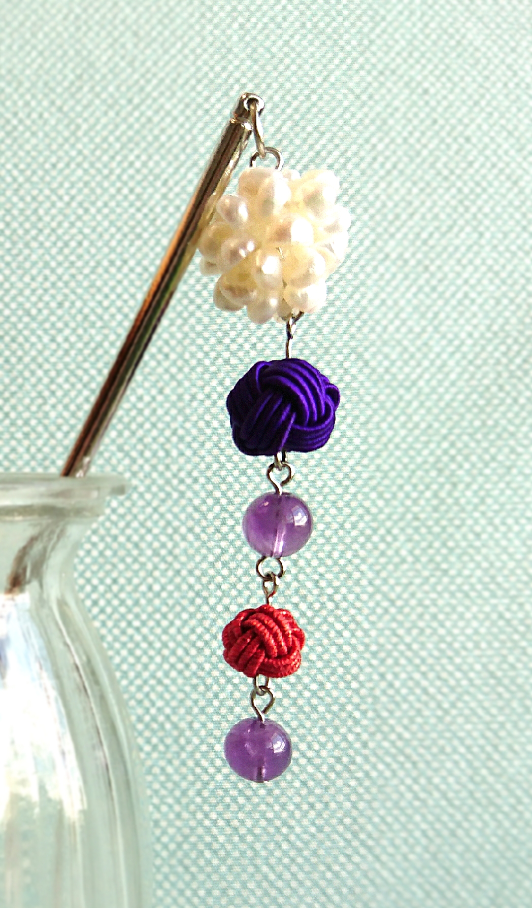 水引玉と淡水パールでかんざしを作りました